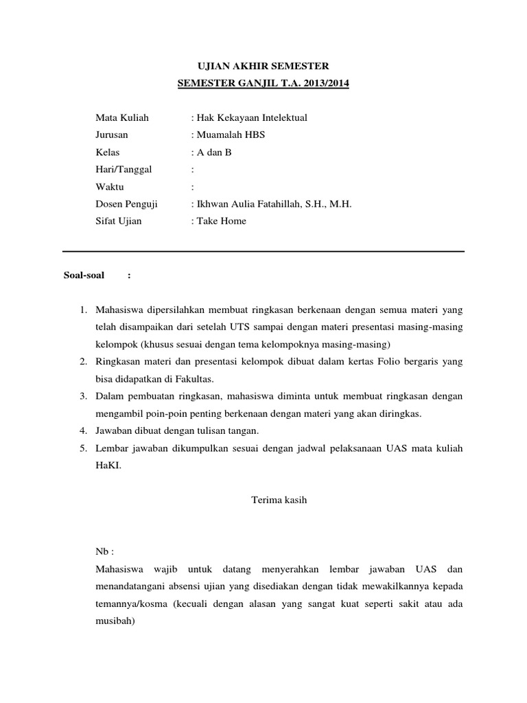 Soal jawaban mid semester hki 2011 b2 program magister kenotariatan. Soal ujian tengah semester.